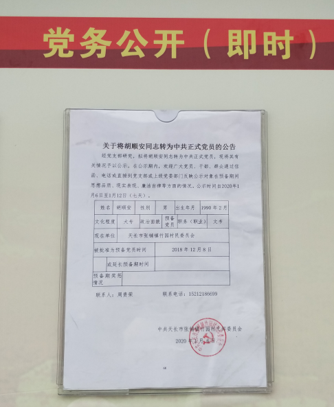 胡順安同志是竹園村預備黨員,他是2015年3月23日申請入黨,于2018年12月8日轉為中共預備黨員。