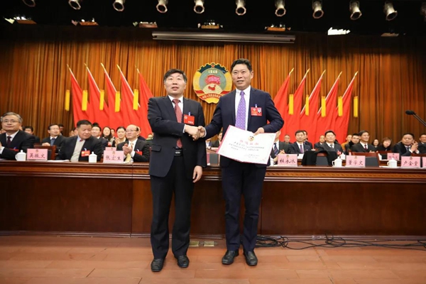 政協(xié)第十一屆天長市委員會主席盧金堂為新當(dāng)選的政協(xié)第十一屆天長市委員會秘書長王洪玉頒發(fā)當(dāng)選證書。