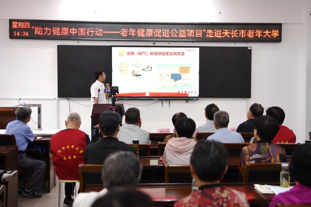 2023年9月21日,由中國健康促進基金會聯合中國老年大學協會、中國疾病預防控制中心、國家皮膚與免疫疾病臨床醫學研究中心等機構共同舉辦的助力健康中國行動——老年健康促進公益項目走進天長市老年大學,為老年朋友普及老年常見皮膚病的預防和治療相關常識。