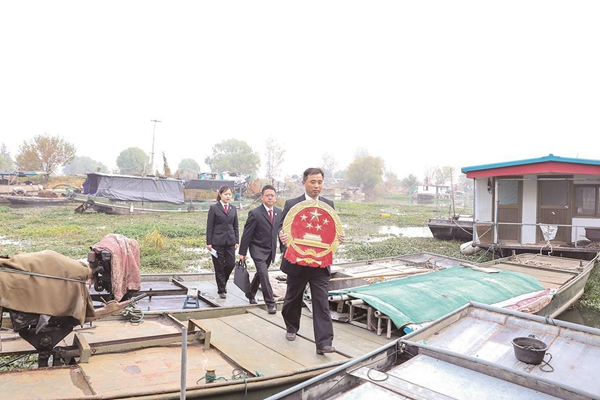 天長市與湖為畔,高郵湖作為長江水系,也是國家十年禁漁水域,當地漁民因此全部上岸定居生活,由此經常產生一些矛盾糾紛。為就地化解漁民糾紛,天長法院銅城法庭經常開展巡回審判。2022年11月,該庭法官把庭開到漁船上,就地審理一起因漁民退捕補償款分割引發的婚后財產糾紛,順利調解成功,收到了良好的社會效果。“我們考慮到此類糾紛在漁民中多發,把庭審現場搬到漁船上,能收到‘審理一案,教育一片’的社會效果。”該院第五支部黨支部書記、法庭庭長劉緒凱事后介紹。