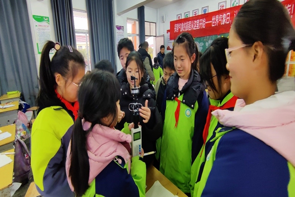 科普志愿者通過專題講座和觀看科普影片的形式,向孩子們普及了今年世界氣象日的主題、天長氣候、全球氣候變化、溫室效應、讀懂天氣預報以及如何應對氣候變化等知識。隨后,志愿者向孩子們展示自動氣象站的構造,講解各種儀器的名稱、作用以及工作原理。在講解風向風速傳感器時,志愿者讓孩子們吹動風杯感受風力的大小,告訴他們風向的簡易判別方法;在對著雨量傳感器構造講解計數(shù)翻斗和干簧管的作用時,志愿者讓孩子們拿上一瓶水,通過現(xiàn)場向儀器倒水的形式,親自體驗降雨量的大小……志愿者用通俗易懂的語言將深奧的理論、專業(yè)的知識與生活中常見的例子結合起來,讓學生聽得懂、學得會。