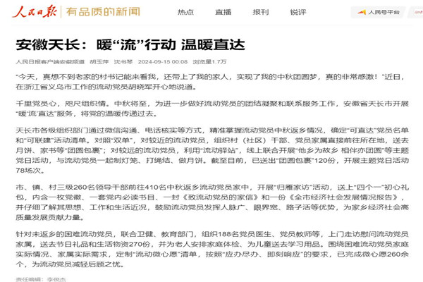 千里黨員心,咫尺組織情。中秋將至,為進一步做好流動黨員的團結凝聚和聯系服務工作,安徽省天長市開展“暖‘流’直達”服務,將黨的溫暖傳遞過去。
