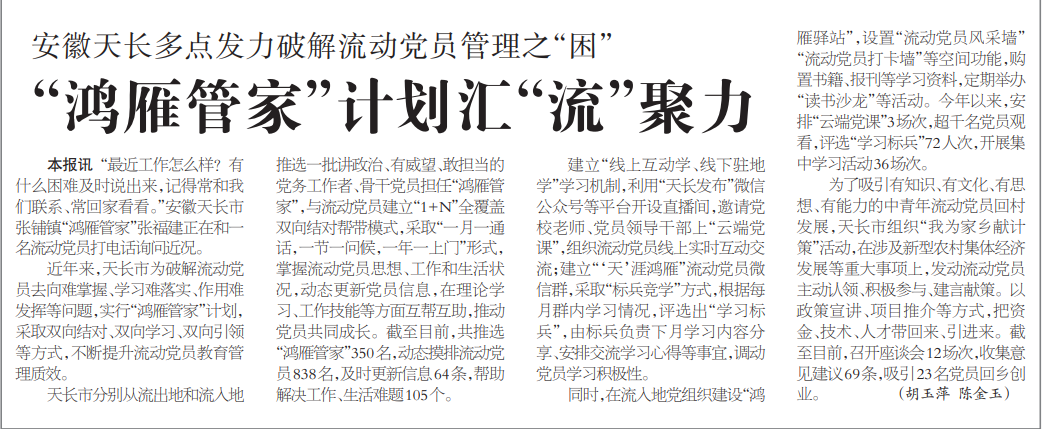 近年來,天長市為破解流動黨員去向難掌握、學習難落實、作用難發揮等問題,實行“鴻雁管家”計劃,采取雙向結對、雙向學習、雙向引領等方式,不斷提升流動黨員教育管理質效。